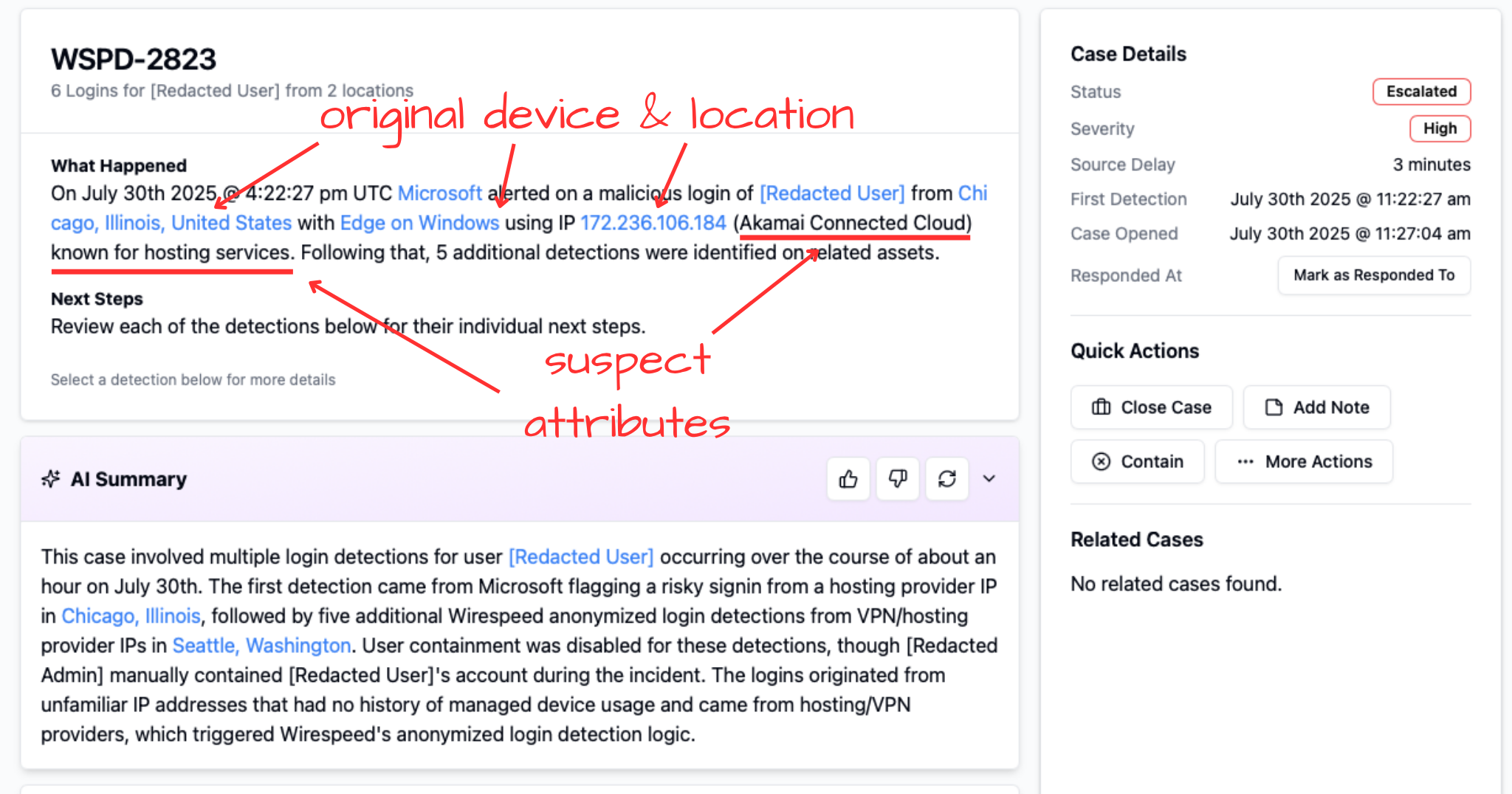 We recently rolled out our take on custom detections which not only detect, but triage immediately upon detection. In this case, our Anonymized Login detections identified five suspicious logins that Microsoft missed.