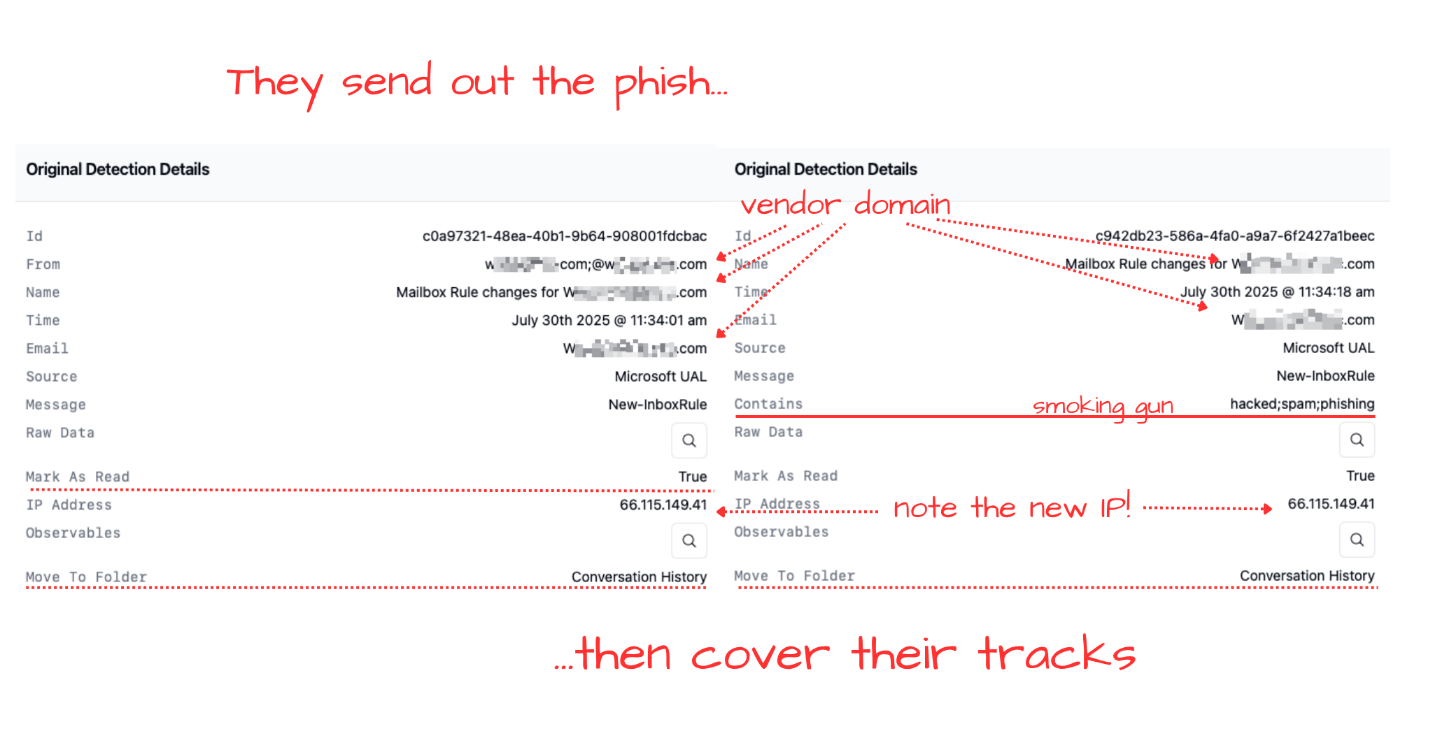 We see ATO (account takeovers) all the time, but often without material impact, most likely because the attacker triaged the stolen account’s access and realized there was no access to monetize (i.e they’re not a technical user for ransomware, nor are they a financial user for BEC wire fraud). In this case, the attacker saw an angle. At 04:34:15 PM UTC the attacker, now using the VPN IP and wasting no time, added two mailbox rules to the accountant’s mailbox: