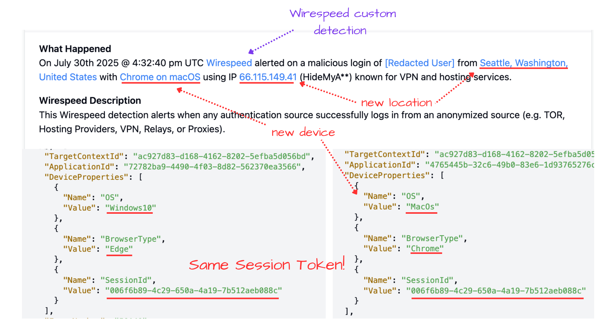Diving into the first Anonymized login, we see at 04:32:40 pm UTC a login reused the same session token but this time the browser is Chrome on MacOS not Edge on Windows 10 like the first event. With a “bite” on their phish, the attacker switched to using the stolen access interactively from a privacy VPN.