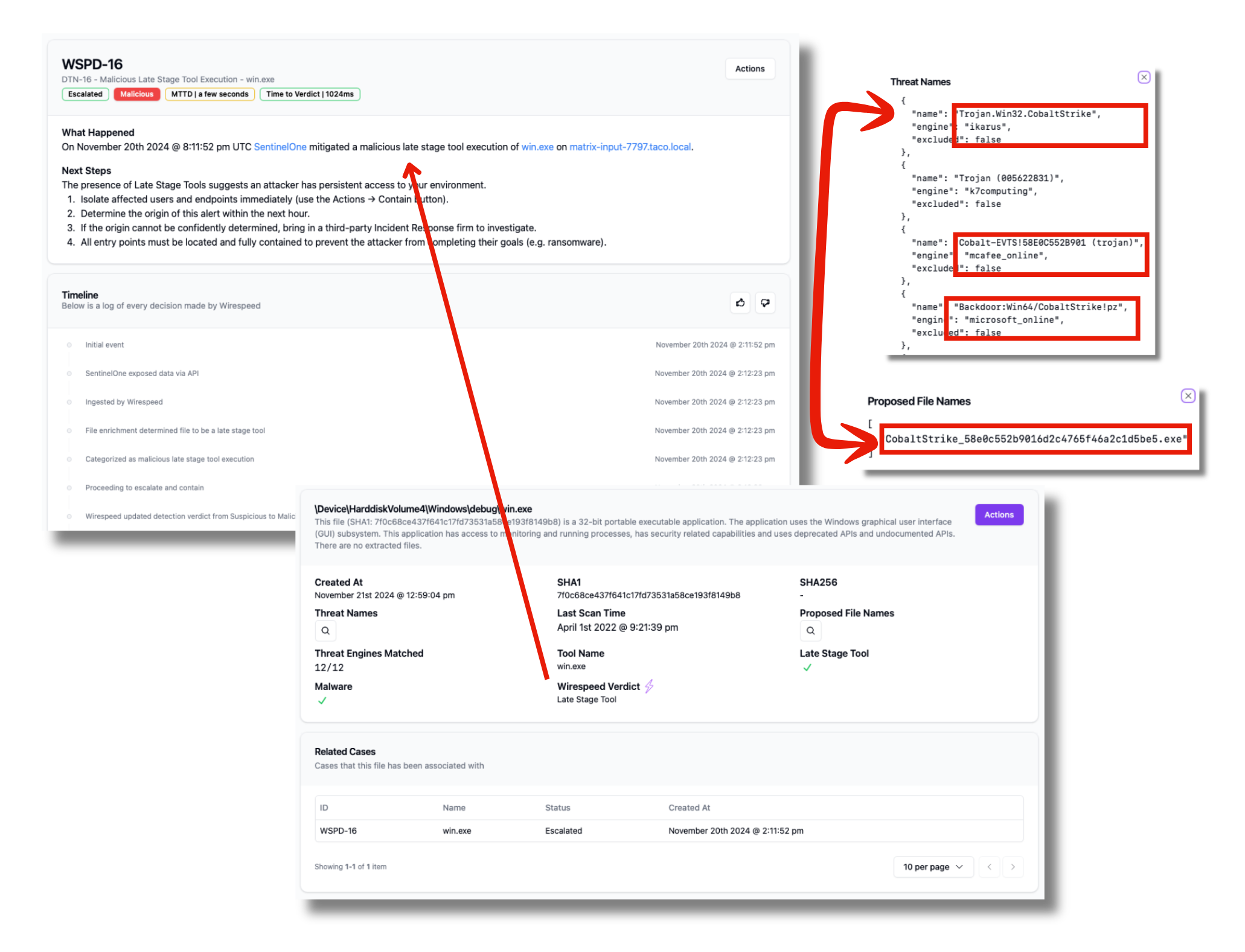 First, Wirespeed brings a Red Team background to our approach to MDR, so we maintain lists of the kinds of tools we used as Red Teamers: privilege escalation, lateral movement, interactive C2, etc., and we include families of ransomware and closed source criminal C2 families as well. We discover their presence through indicators in source telemetry you send to us as well as from our File Reputation Enrichment Providers.
