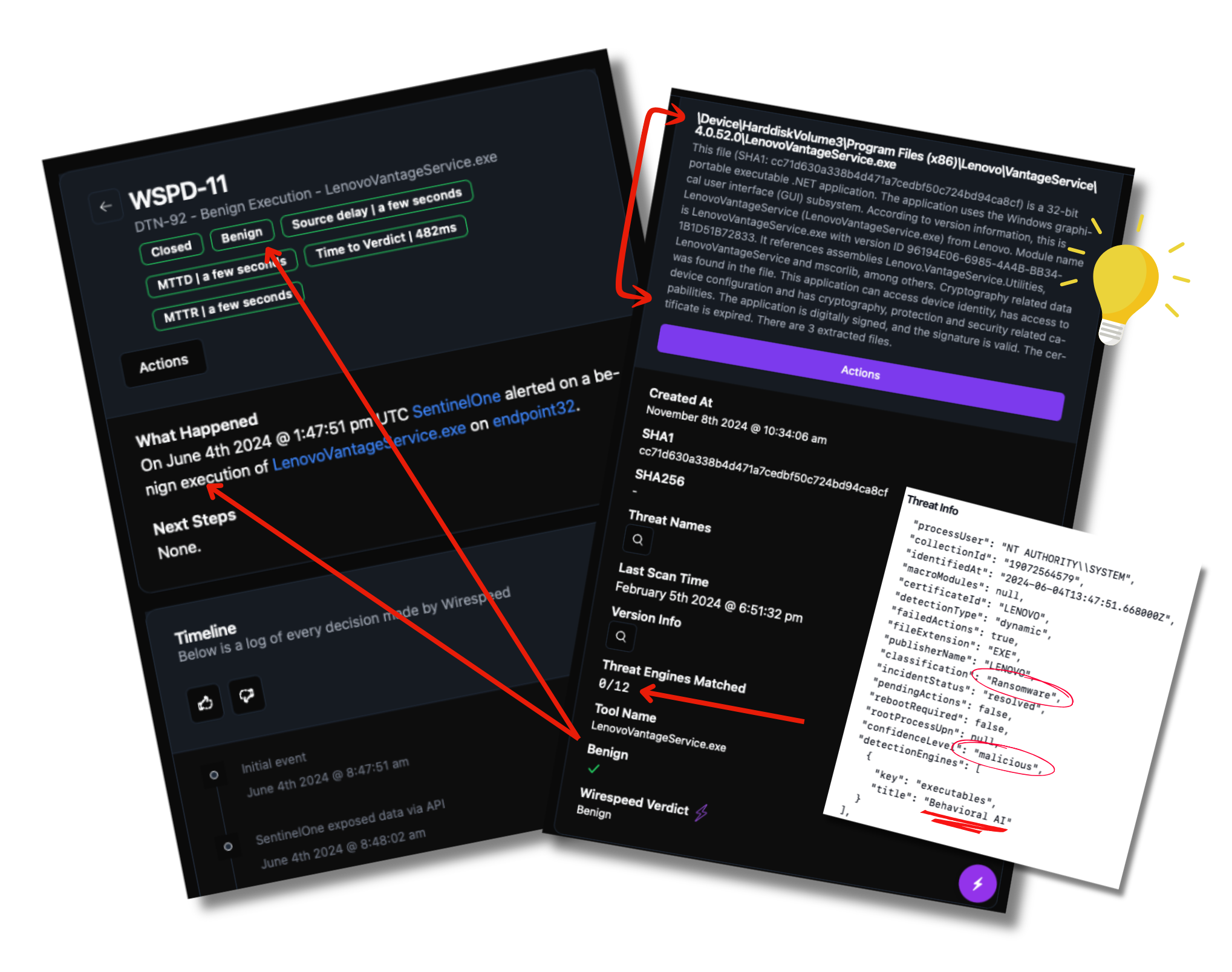 In this case, we enriched the detection with our file reputation integration and confidently used our third-party opinions to dismiss the alert as benign. We can clearly see this is a legitimate application from Lenovo. True to our Wirespeed name, we were able to process the entire alert with all of our enrichments and decisions in just under a half second (482ms) and our customer could stay focused on things that mattered that day—not chasing fake ransomware!
